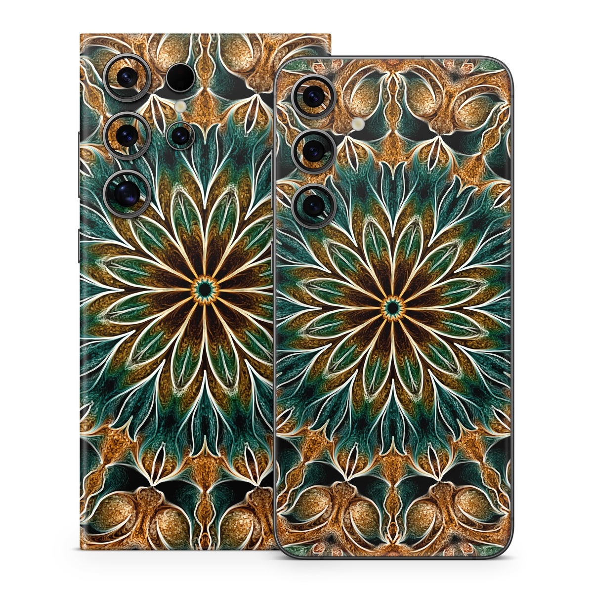 iStyles Samsung Galaxy S24 Series Skin design of Pattern, Symmetry, Textile, Art, Psychedelic art, Tapestry, Design, Visual arts, Kaleidoscope, Motif, with green, orange, yellow, brown, red colors, and tagged with patterns, abstract, orange, teal.