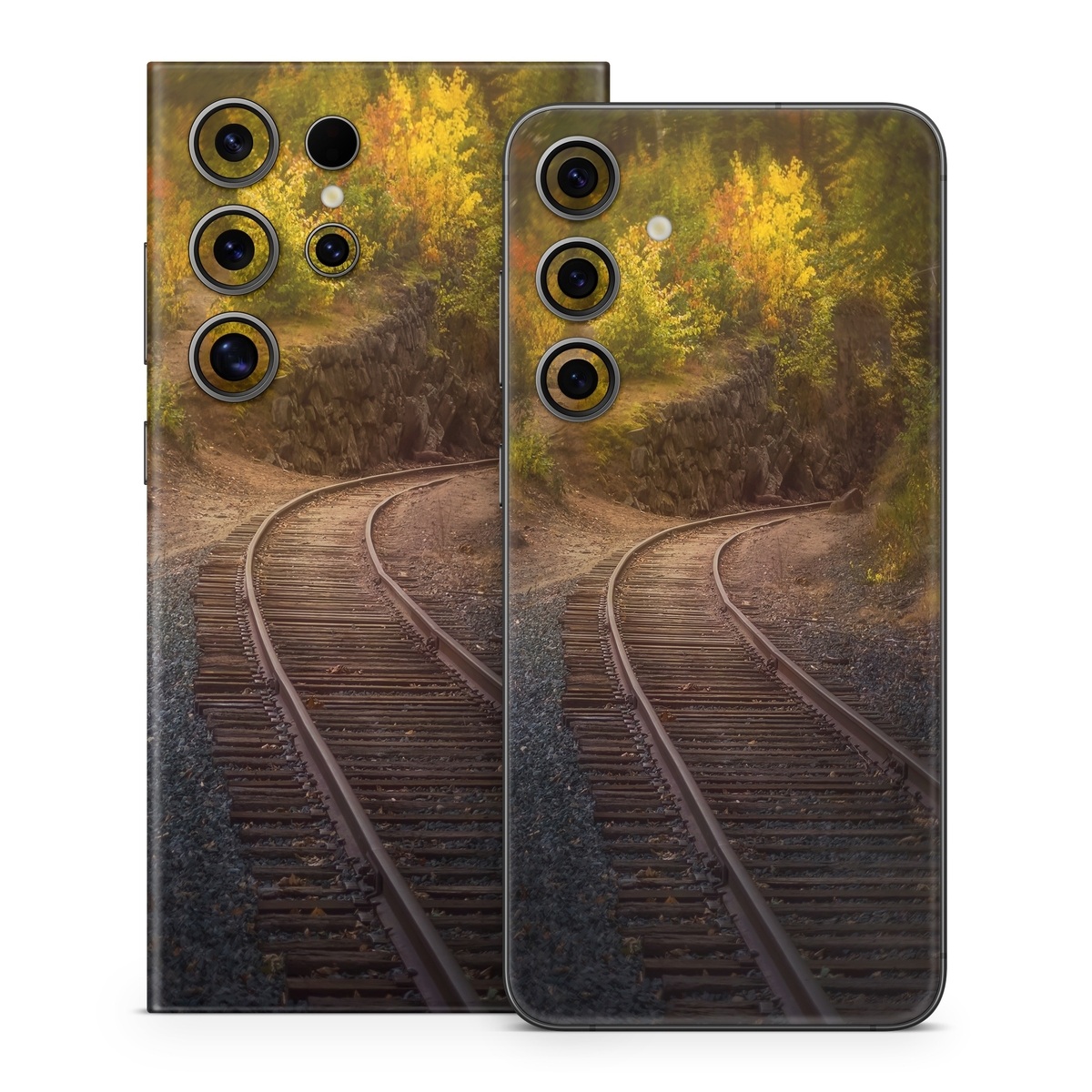 iStyles Samsung Galaxy S24 Series Skin design of Plant, Wood, Branch, Natural landscape, Road surface, Track, Grass, Tree, Thoroughfare, Twig, with brown, gray, yellow, orange, green, red colors, and tagged with nature, objects, nature, outdoors, photography, train, traintracks.