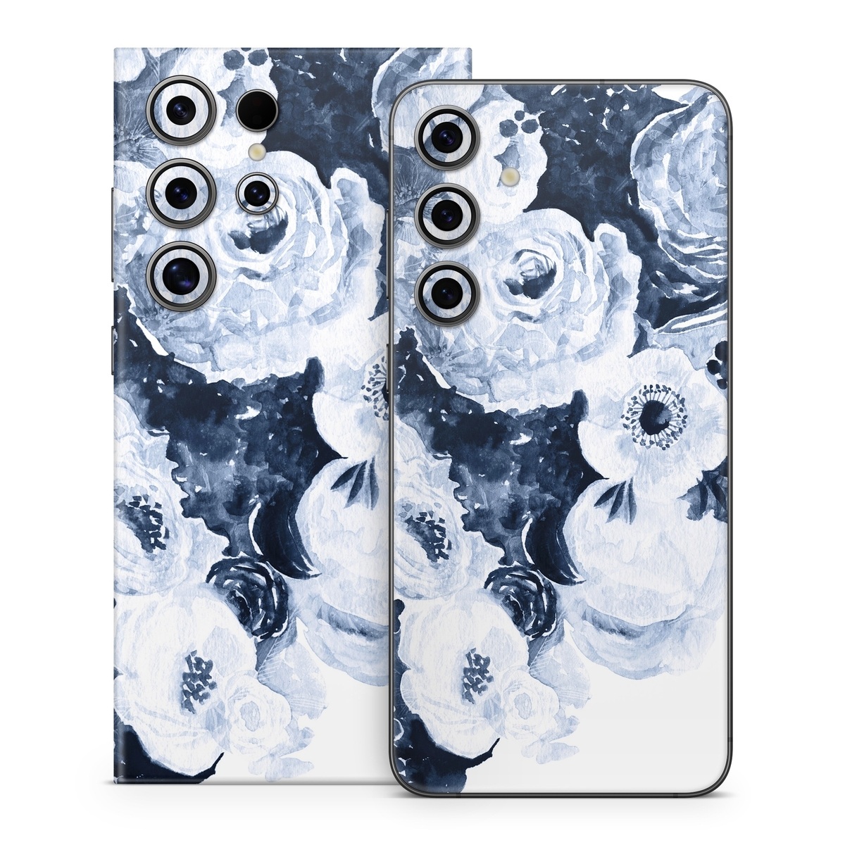 iStyles Samsung Galaxy S24 Series Skin design of White, Flower, Cut flowers, Garden roses, Plant, Bouquet, Rose, Black-and-white, Rose family, Still life, with white, blue colors, and tagged with flowers, blue, bouquet, floral, flowers, watercolor.