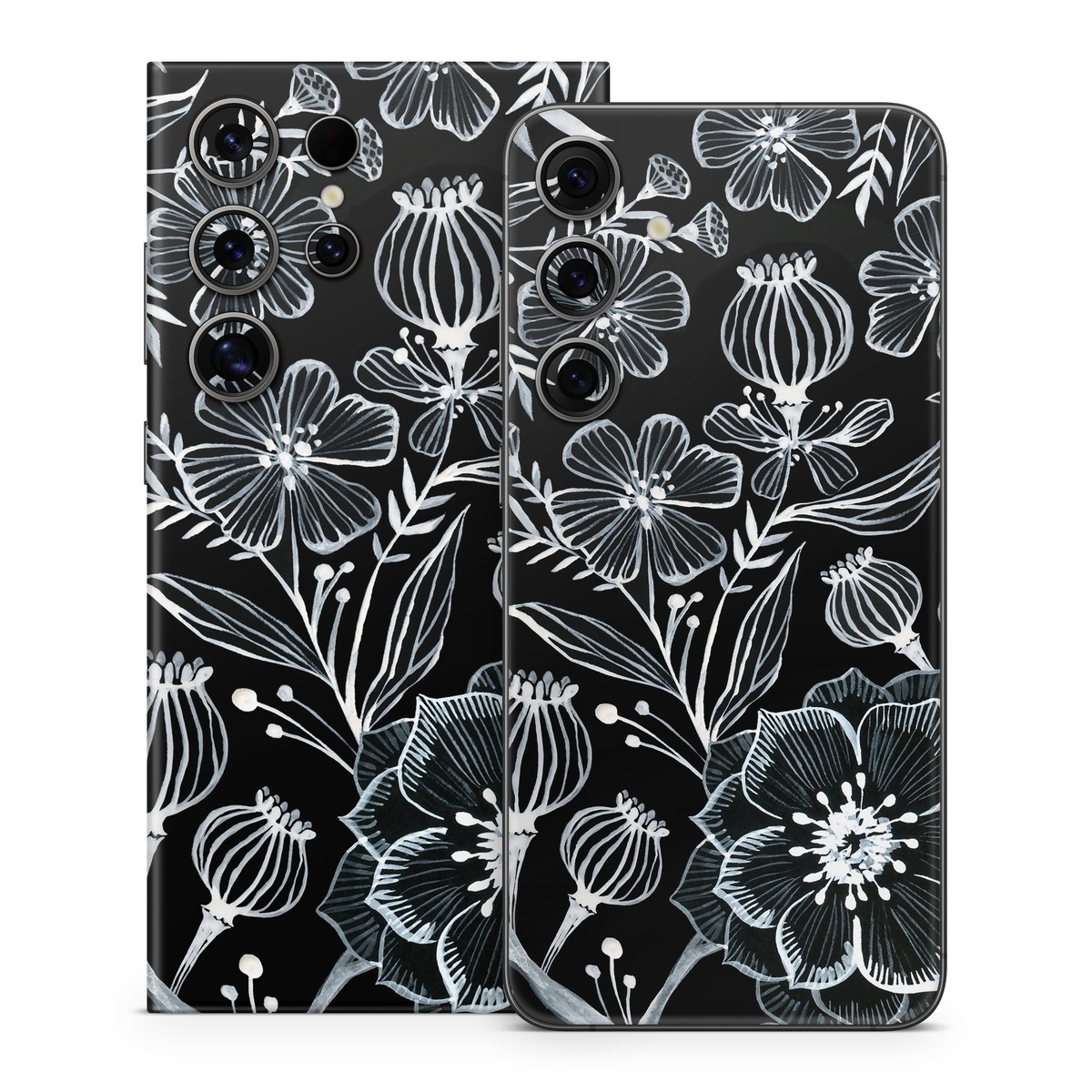 iStyles Samsung Galaxy S24 Series Skin design of Pattern, Black-and-white, Flower, Monochrome photography, Plant, Design, Monochrome, Botany, Wildflower, Visual arts, with black, white colors, and tagged with flowers, patterns, blackandwhite, botanical, floral, flowerpattern, flowers.
