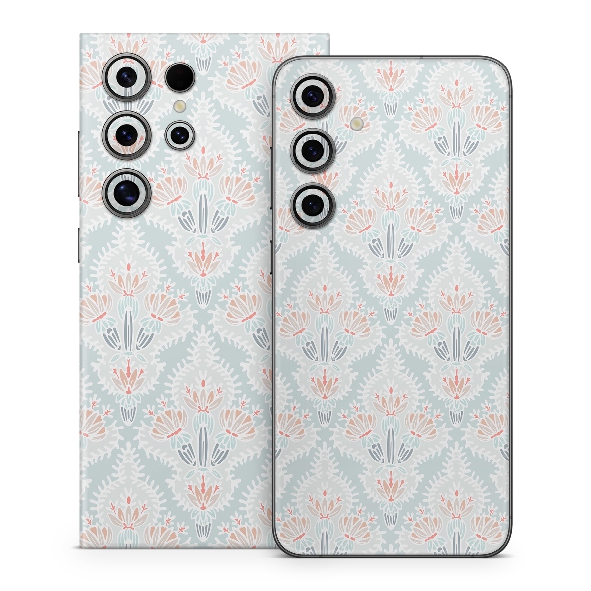 iStyles Samsung Galaxy S24 Series Skin design of Pattern, Aqua, Line, Design, Textile, Wrapping paper, Pedicel, Dahlia, Visual arts, with blue, red, white colors, and tagged with patterns, flowers, cactus, floral, flowers, pattern, soft.