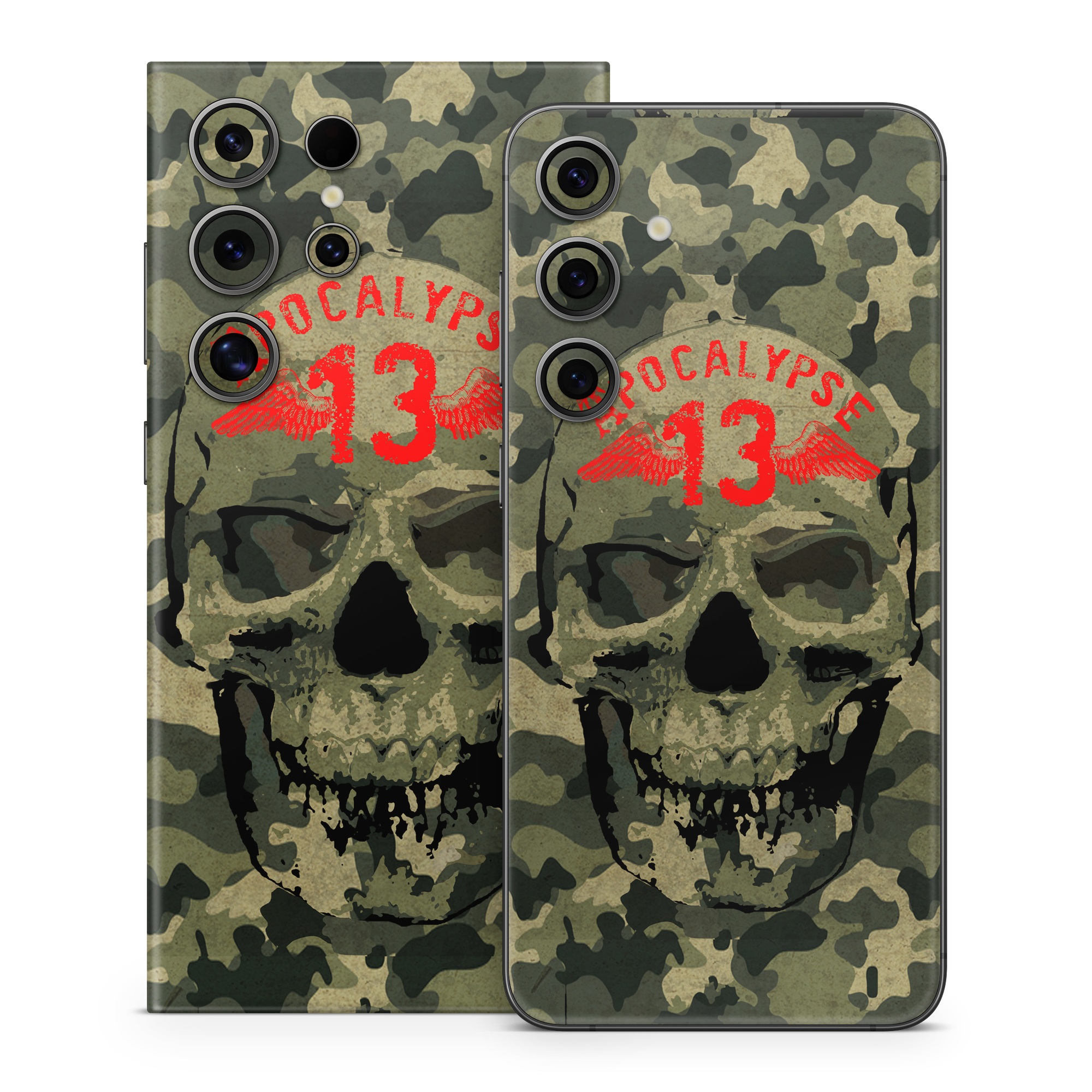iStyles Samsung Galaxy S24 Series Skin design of Bone, Jaw, Art, Font, Skull, Snout, Visual arts, Pattern, Graphics, Graphic design, with black, green, red colors, and tagged with skulls, signs, military, patterns, fantasy, apocalypse, thirteen, military, camo.