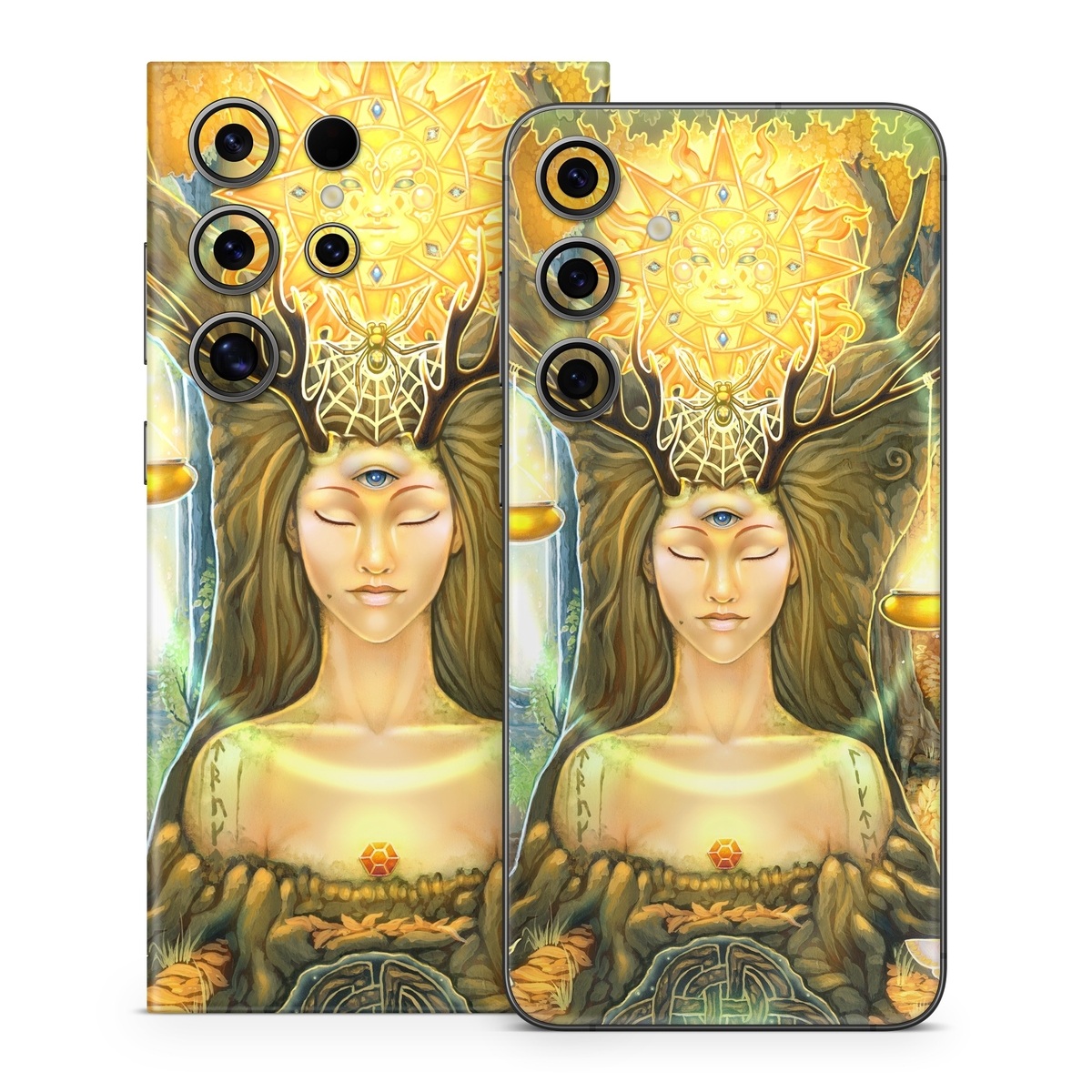 iStyles Samsung Galaxy S24 Series Skin design of Painting, Art, Illustration, Plant, Fictional character, Mythology, Cg artwork, Visual arts, Glass, Drawing, with yellow, green, brown, pink, orange, black colors, and tagged with fantasy, people, signs, animals, nature, objects, flames, sun, woman, trees, symbols.