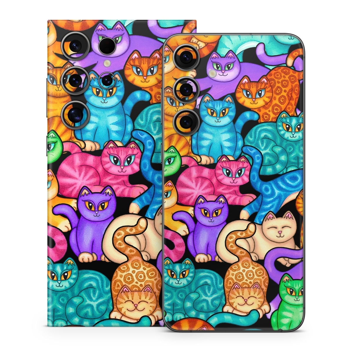iStyles Samsung Galaxy S24 Series Skin design of Cat, Cartoon, Felidae, Organism, Small to medium-sized cats, Illustration, Animated cartoon, Wildlife, Kitten, Art, with black, blue, red, purple, green, brown colors, and tagged with patterns, animals.