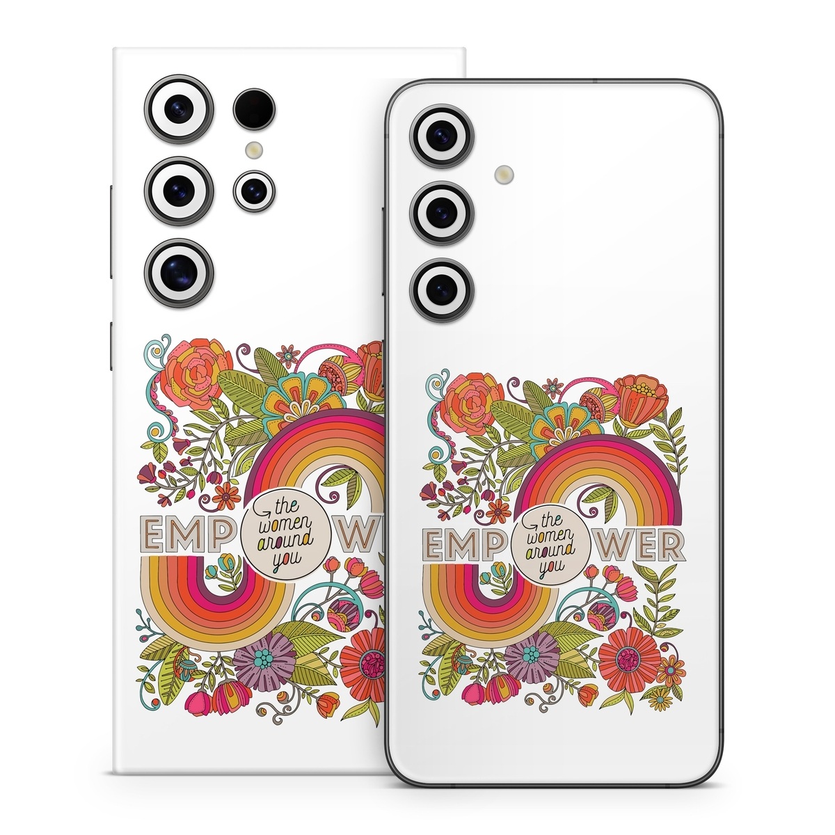 iStyles Samsung Galaxy S24 Series Skin design of Botany, Flower, Font, Creative arts, Petal, Circle, Pattern, Art, Visual arts, Floral design, with white, red, yellow, orange, green, blue colors, and tagged with flowers, signs, flowers, rainbow, empower, women, around, you.