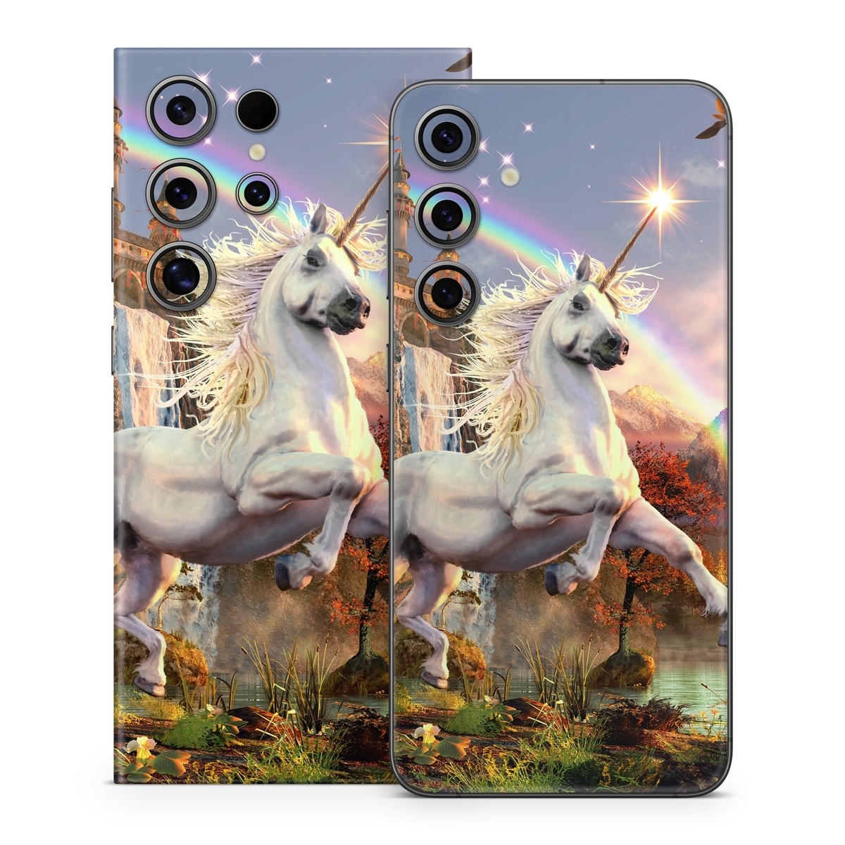 iStyles Samsung Galaxy S24 Series Skin design of Nature, Unicorn, Fictional character, Sky, Mythical creature, Mythology, Cg artwork, Horse, Mane, Wildlife, with black, gray, red, green, blue colors, and tagged with animals, fantasy, nature, urban.