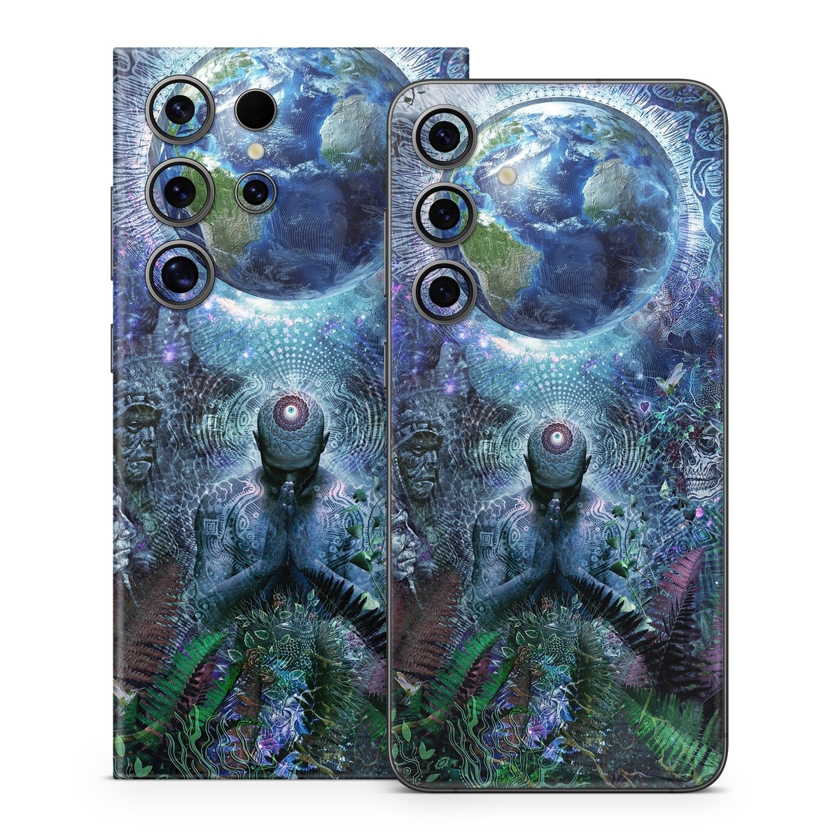 iStyles Samsung Galaxy S24 Series Skin design of Psychedelic art, Fractal art, Art, Space, Organism, Earth, Sphere, Graphic design, Circle, Graphics, with blue, green, gray, purple, pink, black, white colors, and tagged with people, fantasy, space, signs, dmt, fantasy, gratitude, indian, jungle, love, lsd, nativeamerican, nature, peace, plants, ritual, scifi, skulls, space, spirits, spiritual, symbols, trippy, world, worldpeace.