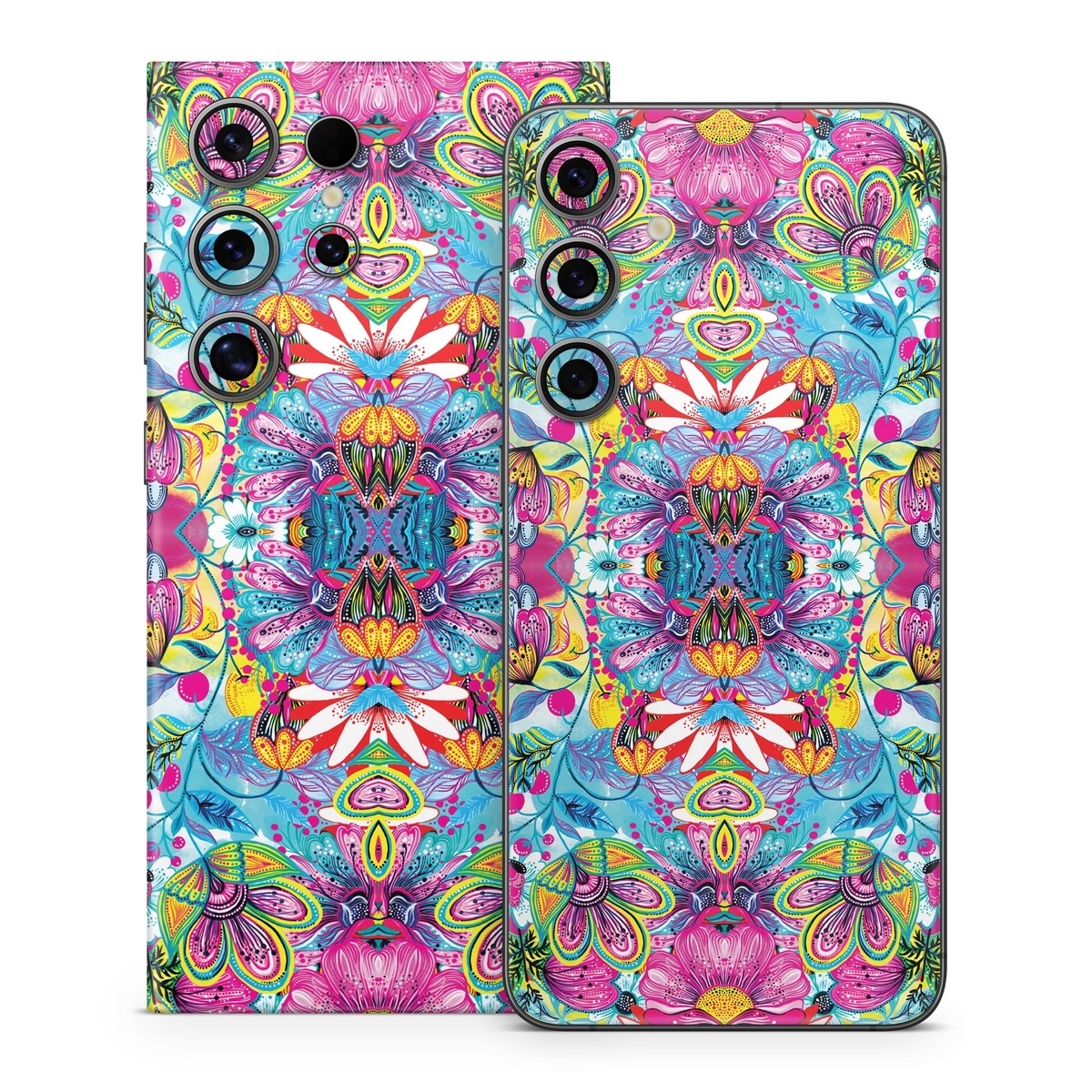iStyles Samsung Galaxy S24 Series Skin design of Pattern, Psychedelic art, Design, Textile, Visual arts, Art, Magenta, Motif, Symmetry, Paisley, with pink, blue, purple, yellow, orange, green, red colors, and tagged with patterns, flowers, bright, colorful, doodles, flowers, pastels.