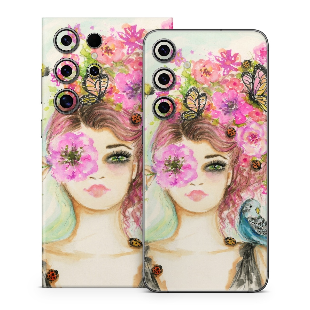 iStyles Samsung Galaxy S24 Series Skin design of Face, Watercolor paint, Illustration, Pink, Head, Fashion illustration, Beauty, Art, Cheek, Painting, with white, pink, green, blue, yellow, red, brown colors, and tagged with people, fineart, objects, animals, flowers, nature, drawn, floral, flower, flowers, girl, handdrawn, nature, pastel, portrait, woman, bird, bee, butterfly.