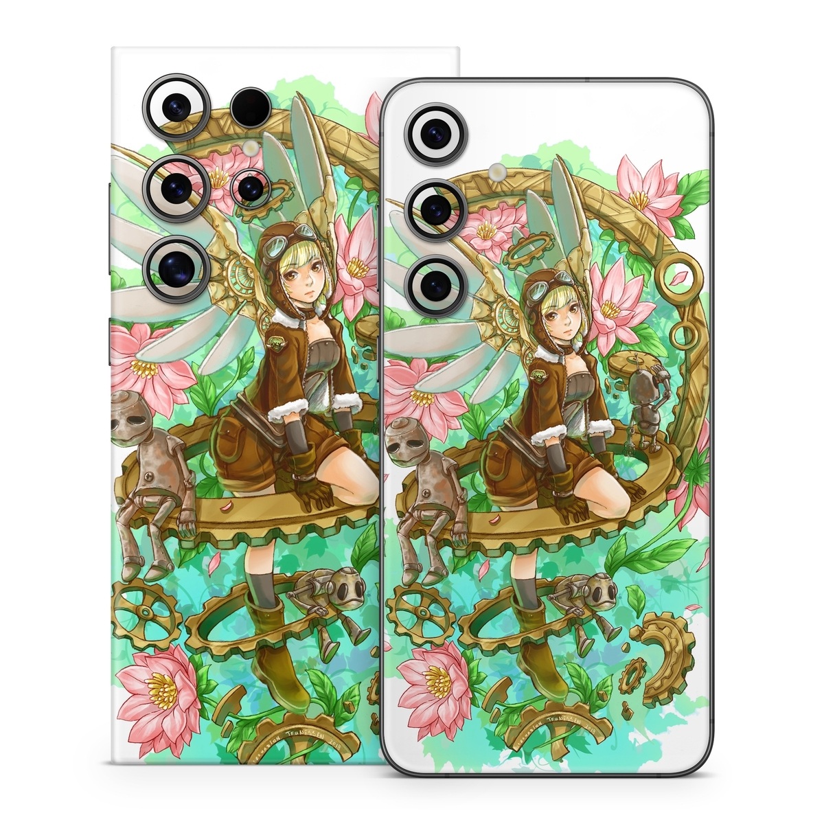 iStyles Samsung Galaxy S24 Series Skin design of Illustration, Fictional character, Clip art, Art, Graphics, Plant, with white, yellow, pink, green, brown, black colors, and tagged with people, fineart, fantasy, flowers, objects, angel, flowers, gear, gears, girl, pinup, pinupgirl, punk, steampunk, tinker.