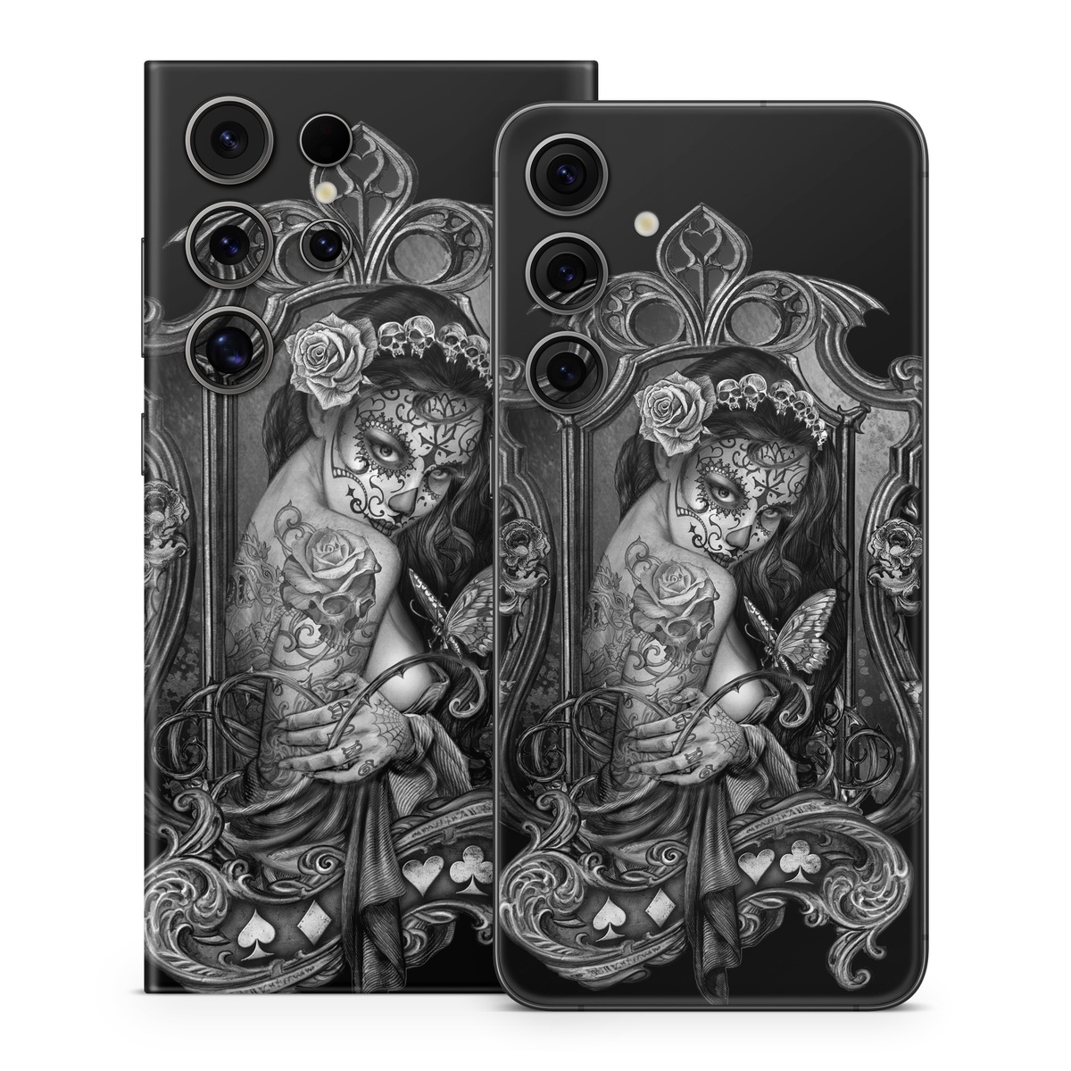 iStyles Samsung Galaxy S24 Series Skin design of Style, Art, Monochrome, Black-and-white, Monochrome Photography, Visual Arts, Illustration, Painting, Drawing, with black, white, gray colors, and tagged with skulls, people, animals, flowers, objects, bride, girl, goth, gothic, lady, skull, sugarskull, tattoo, tattoos, woman.