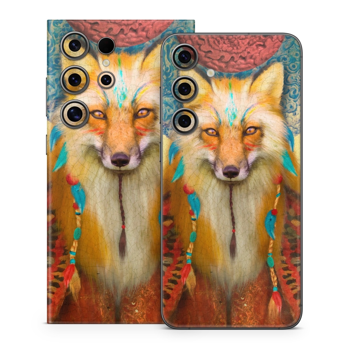 iStyles Samsung Galaxy S24 Series Skin design of Red fox, Canidae, Fox, Wildlife, Swift fox, Carnivore, Jackal, Fur, Snout, Art, with red, black, gray, green, blue colors, and tagged with animals, patterns.