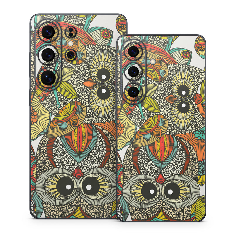iStyles Samsung Galaxy S26 Series Skin design of Owl, Pattern, Visual arts, Art, Design, Textile, Illustration, Motif, Bird, with white, green, orange, yellow, blue, red colors, and tagged with patterns, animals, flowers, nature.