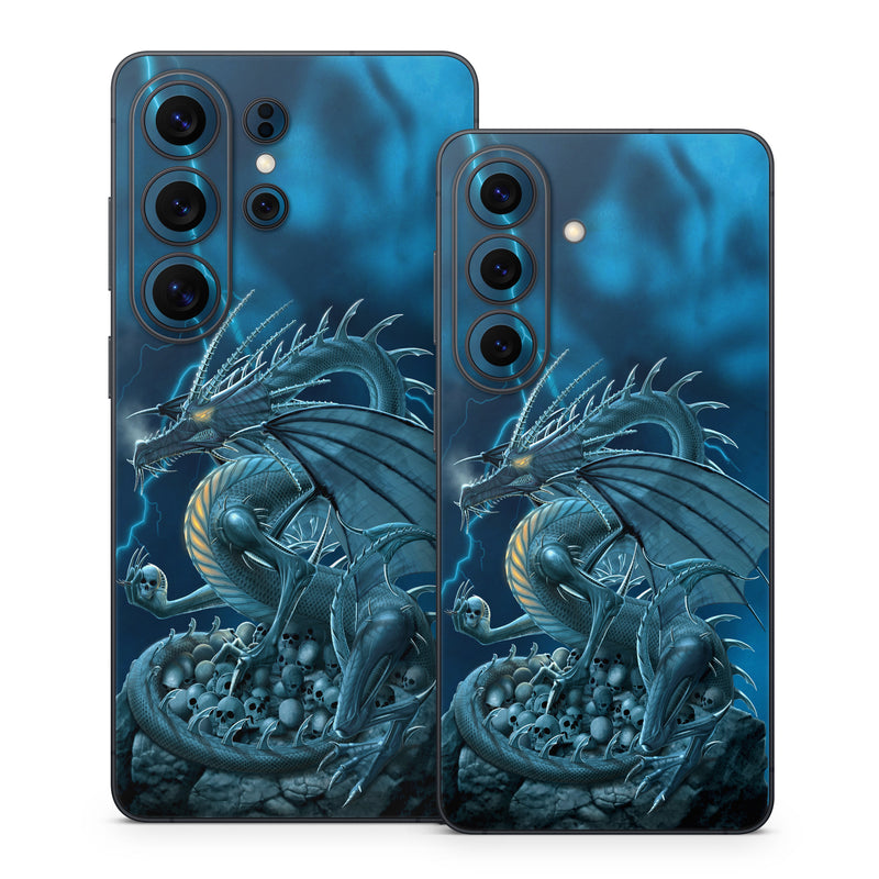 iStyles Samsung Galaxy S26 Series Skin design of Cg artwork, Dragon, Mythology, Fictional character, Illustration, Mythical creature, Art, Demon, with blue, yellow colors, and tagged with fantasy, skulls.