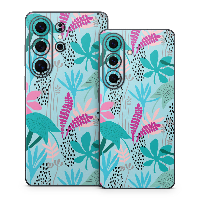 iStyles Samsung Galaxy S26 Series Skin design of White, Leaf, Botany, Green, Textile, Branch, Organism, Plant, Font, Pink, with blue, green, pink, purple, black, gray colors, and tagged with patterns, flowers, nature, flowers, leaves, nature.