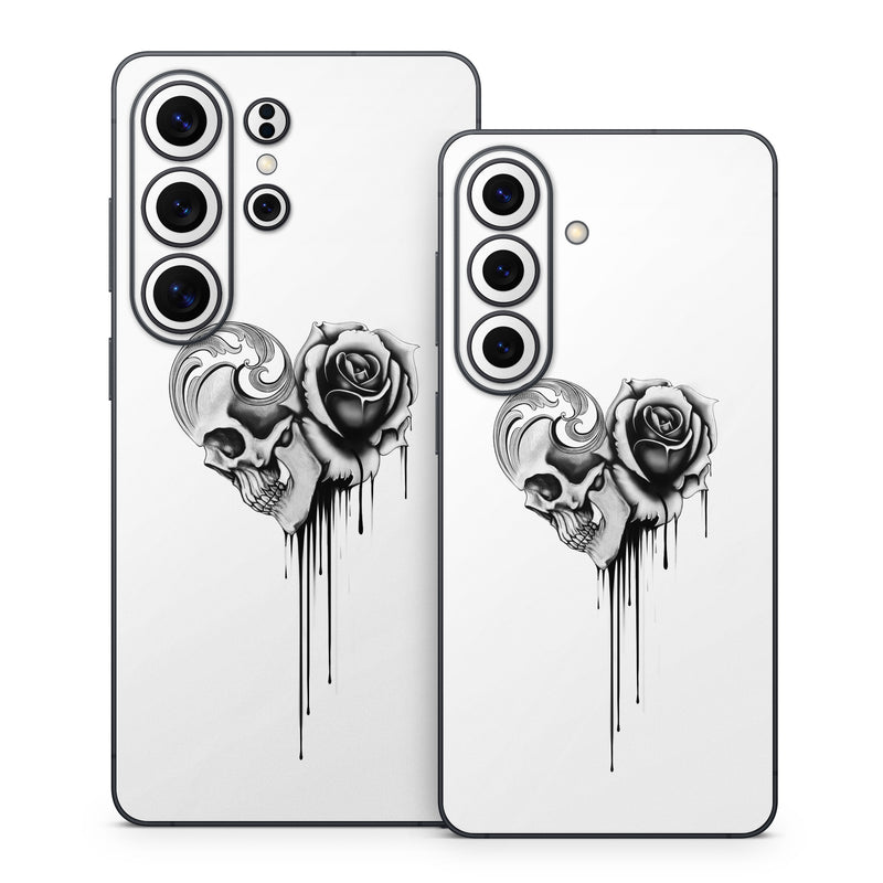 iStyles Samsung Galaxy S26 Series Skin design of Black-and-white, Illustration, Monochrome, Rose, Plant, Style, Metal, Drawing, with white, black, gray colors, and tagged with hearts, flowers, skulls, goth, gothic, heart, ink, inkpen, rose, sketch, skull.
