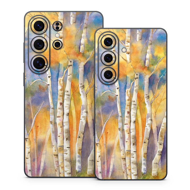iStyles Samsung Galaxy S26 Series Skin design of Canoe birch, Watercolor paint, Tree, Birch, Woody plant, Painting, Plant, Birch family, Paint, Trunk, with orange, yellow, green, white, purple, blue colors, and tagged with nature.