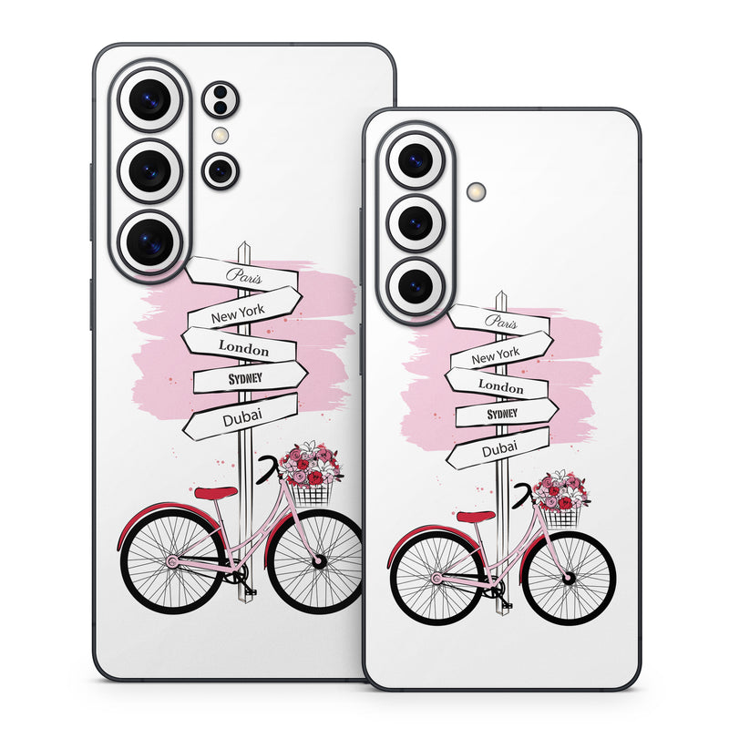 iStyles Samsung Galaxy S26 Series Skin design of Bicycle, Wheel, Bicycles--Equipment and supplies, Tire, Bicycle tire, Bicycle frame, Bicycle wheel, Bicycle wheel rim, Vehicle, Bicycle fork, with white, black, red, pink colors, and tagged with signs, objects, flowers, patterns, bike, flowers, pink, travel, paris, new, york, london, sydney, dubai.