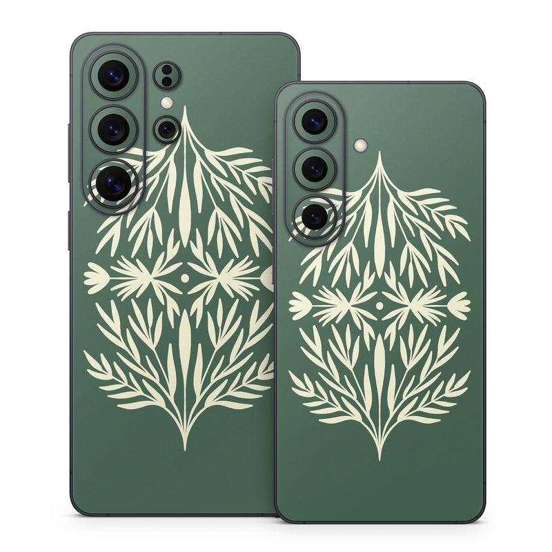 iStyles Samsung Galaxy S26 Series Skin design of Plant, Terrestrial plant, Art, Triangle, Symmetry, Pattern, Electric blue, Graphics, Grass, Visual arts, with green, white colors, and tagged with patterns, nature, tree, branches, leaves.