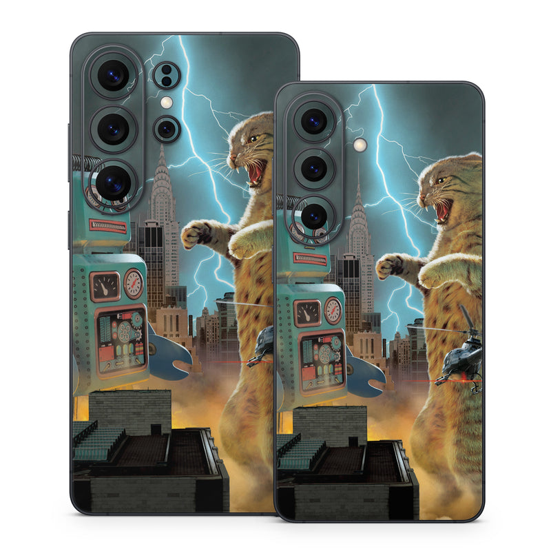 iStyles Samsung Galaxy S26 Series Skin design of Lightning, Felidae, Carnivore, Art, Whiskers, Big cats, Cg artwork, Terrestrial animal, Small to medium-sized cats, Thunder, with black, blue, red, yellow, white, brown, gray, orange colors, and tagged with animals, fantasy, objects, urban, cat, robot, fight, lightning, helicopter.