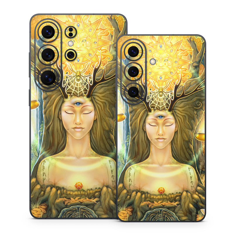 iStyles Samsung Galaxy S26 Series Skin design of Painting, Art, Illustration, Plant, Fictional character, Mythology, Cg artwork, Visual arts, Glass, Drawing, with yellow, green, brown, pink, orange, black colors, and tagged with fantasy, people, signs, animals, nature, objects, flames, sun, woman, trees, symbols.