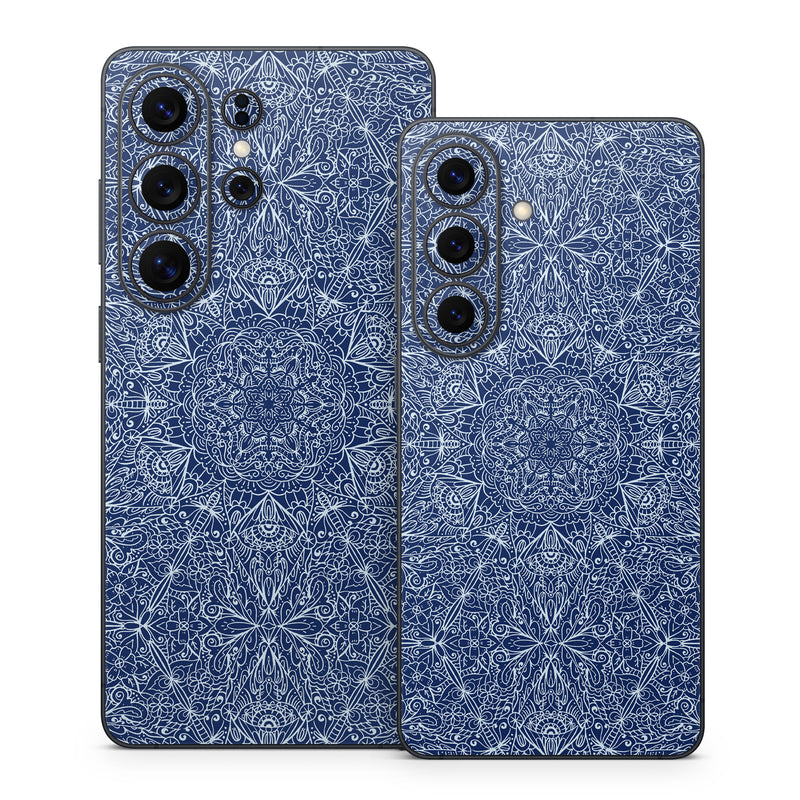 iStyles Samsung Galaxy S26 Series Skin design of Blue, Pattern, Azure, Cobalt blue, Design, Textile, Electric blue, Wallpaper, Symmetry, with blue, white colors, and tagged with patterns, space, blue, bohemian, boho, pattern, white.