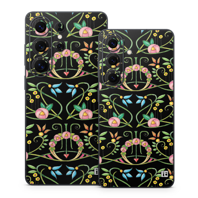 iStyles Samsung Galaxy S26 Series Skin design of Flower, Rectangle, Textile, Ornament, Plant, Line, Motif, Creative arts, Art, Pattern, with black, pink, blue, green, yellow colors, and tagged with patterns, flowers, flower, arc, pattern.