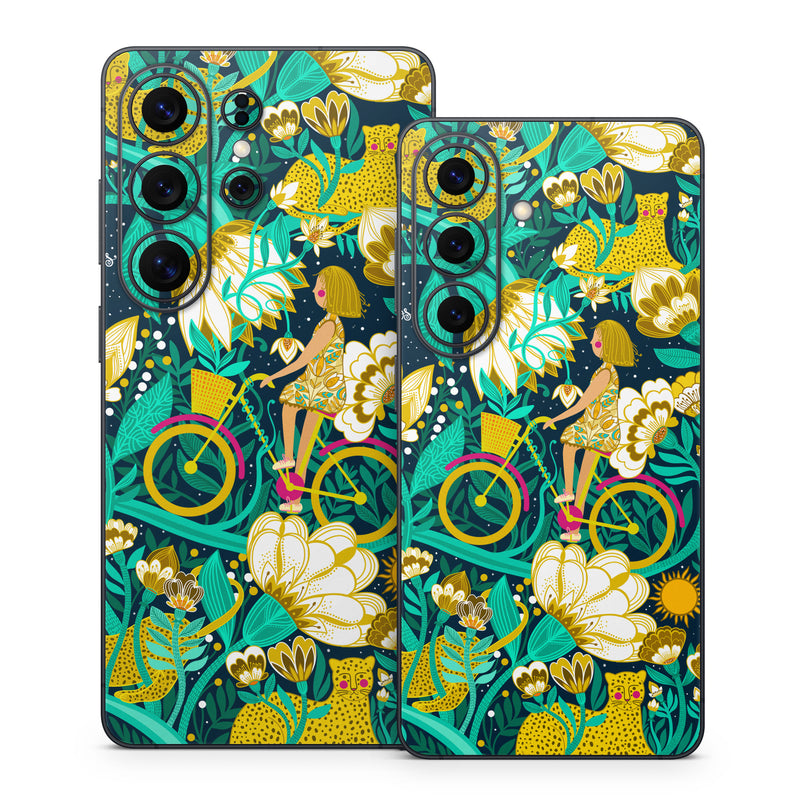 iStyles Samsung Galaxy S26 Series Skin design of Green, Rectangle, Plant, Aqua, Pattern, Electric blue, Art, Motif, Design, Visual arts, with green, black, blue, yellow, pink, white, red, brown colors, and tagged with patterns, flowers, animals, objects, people, cheetah, girl, bicycle, flowers, sun, stars, sky.