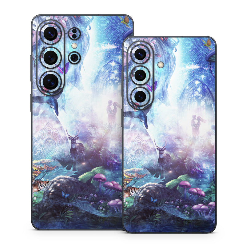 iStyles Samsung Galaxy S26 Series Skin design of Man, Woman, Fictional Character, Mythology, Bird, Wing, Mythical Creature, Deer, Tiger, Mushrooms, Butterfly, with white, blue, green, red, yellow, black, purple, gray colors, and tagged with space, fantasy, animals, nature, urban, people, objects, flowers, dance, dancing, dream, dreaming, fantasy, forest, love, nature, woods.