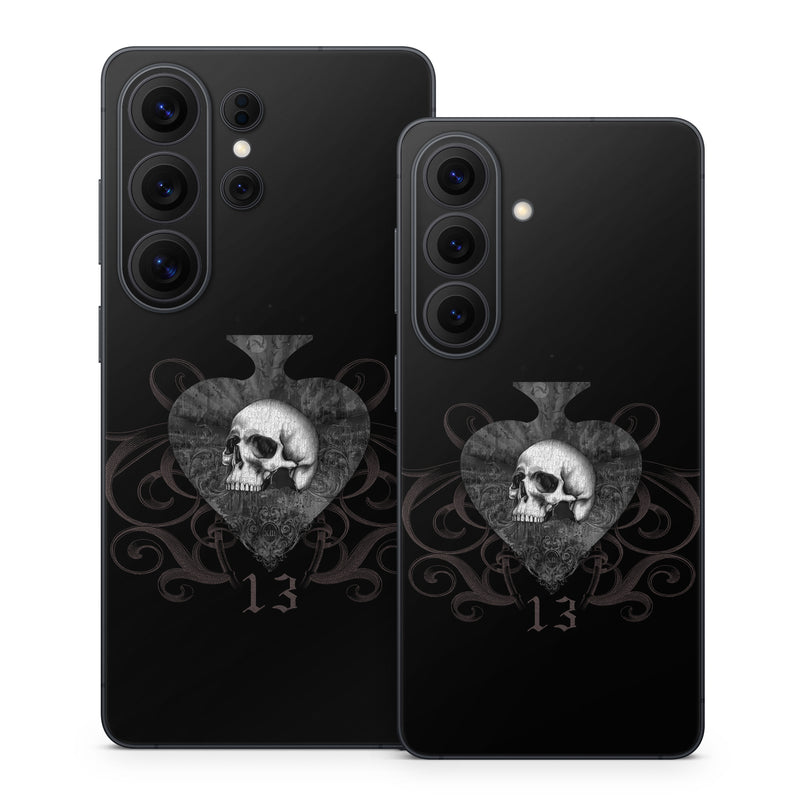 iStyles Samsung Galaxy S26 Series Skin design of Bone, Jaw, Grey, Art, Skull, Font, Darkness, Monochrome photography, Illustration, Monochrome, with black, white, brown colors, and tagged with skulls, signs, patterns, fantasy, skull, thirteen, spade.