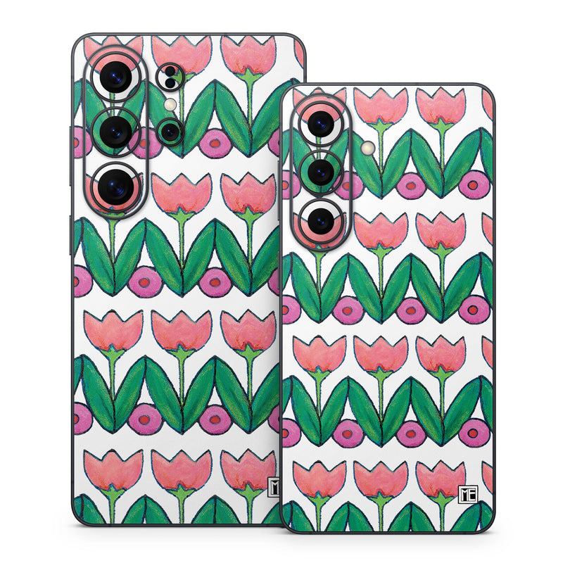 iStyles Samsung Galaxy S26 Series Skin design of Green, Rectangle, Textile, Botany, Line, Symmetry, Art, Font, Pattern, Magenta, with white, green, pink, purple colors, and tagged with patterns, flowers, tulip, drawing, repetative.