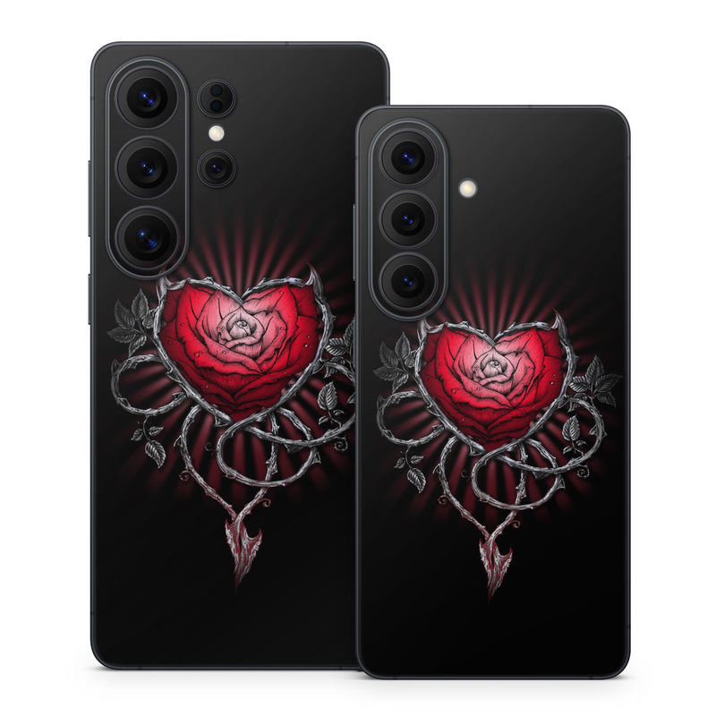 iStyles Samsung Galaxy S26 Series Skin design of Human body, Flash photography, Gesture, Sleeve, Petal, Font, Jewellery, Fictional character, Magenta, Symmetry, with black, white, red, gray colors, and tagged with signs, flowers, hearts, fantasy, vines, thorns, heart, rose.