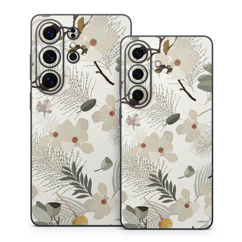iStyles Samsung Galaxy S26 Series Skin design of Branch, Botany, Twig, Plant, Textile, Organism, Art, Creative arts, Pattern, Tints and shades, with white, green, yellow, brown, gray colors, and tagged with patterns, flowers, nature, flowers, leaves.