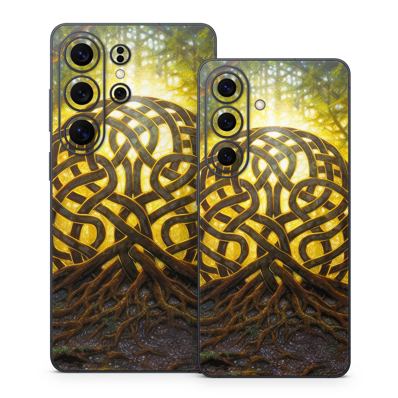 iStyles Samsung Galaxy S26 Series Skin design of Art, Pattern, Circle, Symmetry, Tints and shades, Visual arts, Design, Electric blue, Graphics, Font, with green, brown, black, gray, yellow, orange, white colors, and tagged with fineart, signs, fantasy, nature, symbol, lasting, trees, roots, landscape.