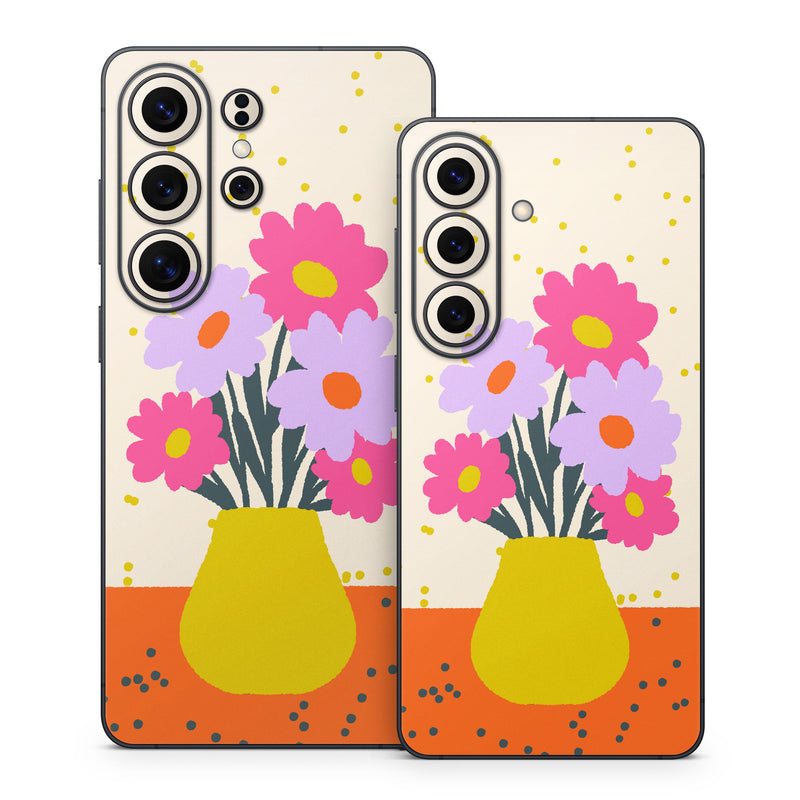 iStyles Samsung Galaxy S26 Series Skin design of Flower, Plant, Vase, Flowerpot, Petal, Happy, People in nature, Liquid, Font, Art, with white, orange, pink, purple, yellow colors, and tagged with flowers, vase, pot.