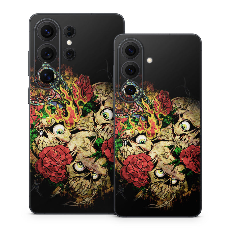 iStyles Samsung Galaxy S26 Series Skin design of Illustration, Bouquet, Art, Skull, Plant, Rose, Flower, Graphic design, Fictional character, Floral design, with black, red, green, gray colors, and tagged with skulls, flowers, animals, bones, grunge, roses, skull, snake.