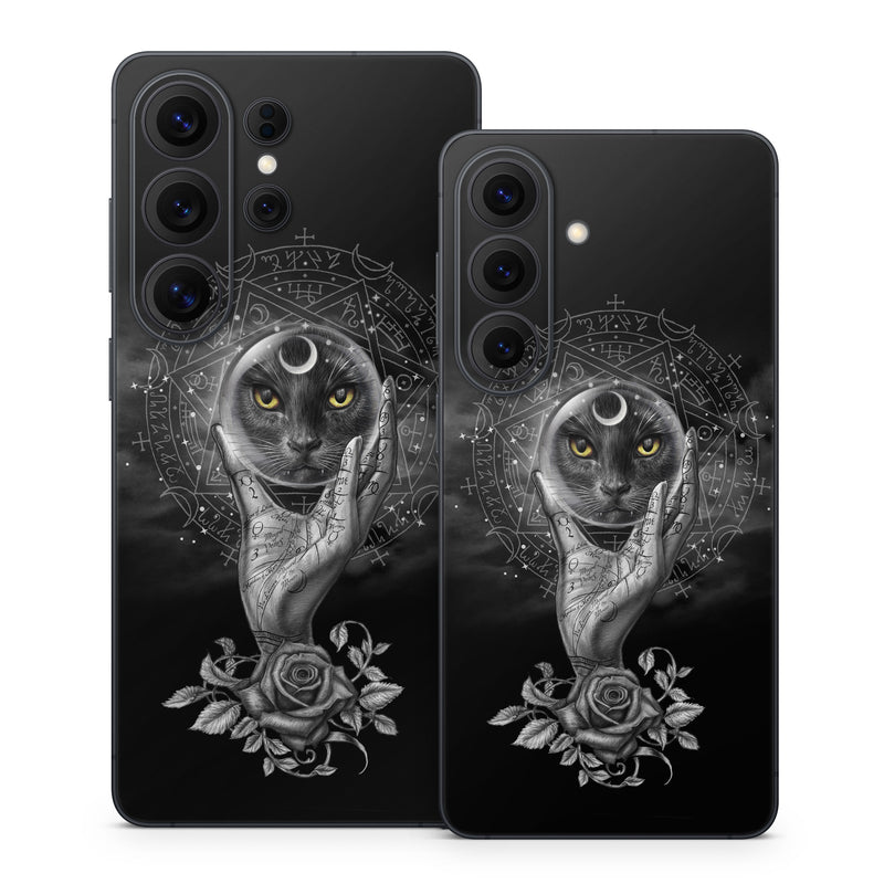 iStyles Samsung Galaxy S26 Series Skin design of Head, Eye, Flash photography, Painting, Headgear, Art, Font, Snout, Darkness, Owl, with black, white, gray colors, and tagged with animals, signs, flowers, people, objects, fantasy, cat, crystal, ball, roses.