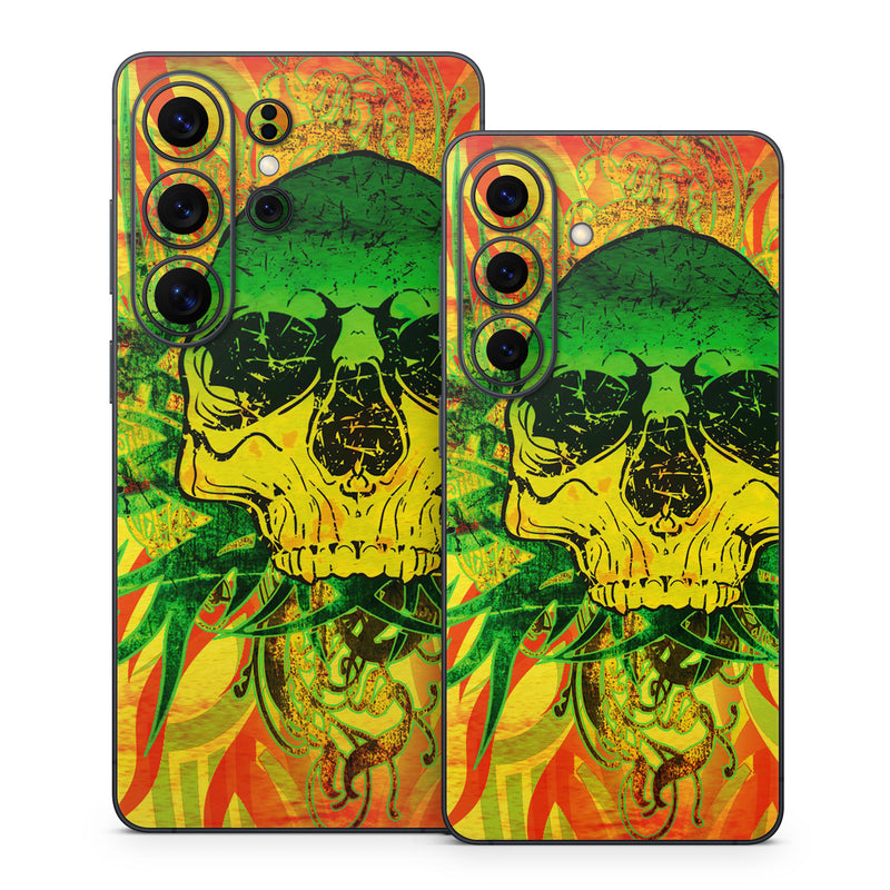 iStyles Samsung Galaxy S26 Series Skin design of Psychedelic art, Skull, Illustration, Bone, Art, Graphic design, Visual arts, Poster, Plant, Painting, with green, orange, black, red colors, and tagged with skulls.