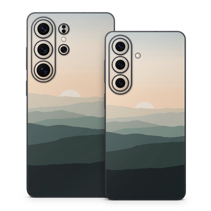 iStyles Samsung Galaxy S26 Series Skin design of Sky, Mountain, Afterglow, Cloud, Highland, Dusk, Sunrise, Landscape, Sunset, Cumulus, with black, gray, white, orange, yellow colors, and tagged with nature, sunset, landscape, mountains, horizon.