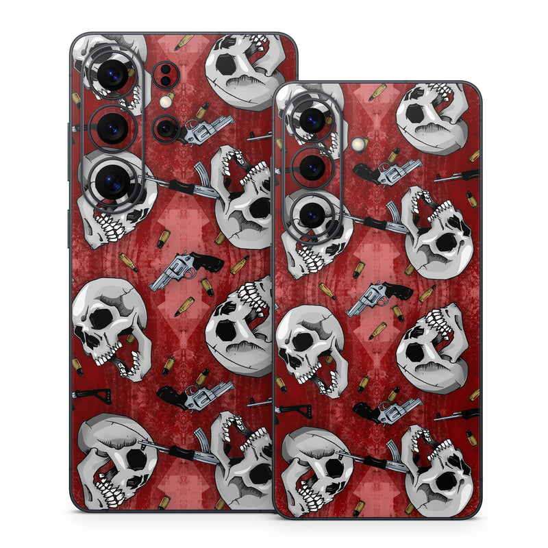 iStyles Samsung Galaxy S26 Series Skin design of Skull, Red, Bone, Personal protective equipment, Skeleton, Mask, Font, Sports gear, Headgear, Pattern, with black, red, gray colors, and tagged with patterns, skulls, objects.