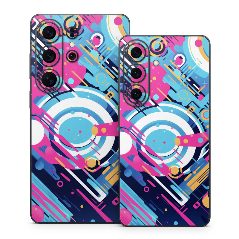 iStyles Samsung Galaxy S26 Series Skin design of Colorfulness, Font, Line, Material property, Art, Magenta, Pattern, Electric blue, Circle, Graphics, with blue, pink, black, white, orange colors, and tagged with abstract, abstract, circles, lines, dripping.