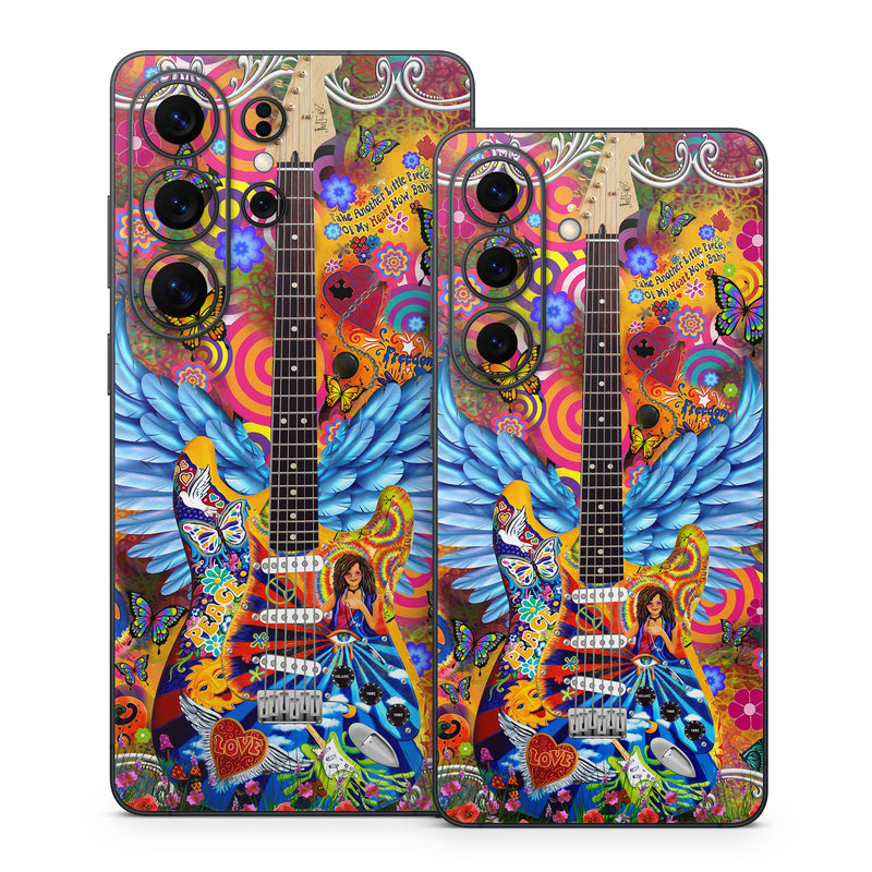 iStyles Samsung Galaxy S26 Series Skin design of Musical instrument, Guitar, Guitar accessory, Textile, Organism, String instrument, Plucked string instruments, String instrument accessory, Art, Font, with red, yellow, orange, pink, black, white, blue, brown, green colors, and tagged with music, flowers, people, signs, animals, nature, objects, hearts, guitar, wings, butterfly, flowers.