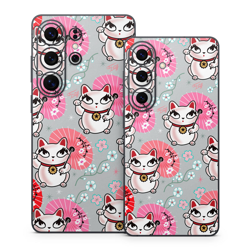 iStyles Samsung Galaxy S26 Series Skin design of Pink, Red, Cartoon, Design, Line, Textile, Pattern, Illustration, Smile, Fictional character, with white, red, pink, gray, blue, black colors, and tagged with patterns, animals, objects, cat, cats, fantasy, flower, flowers, grey, pink.