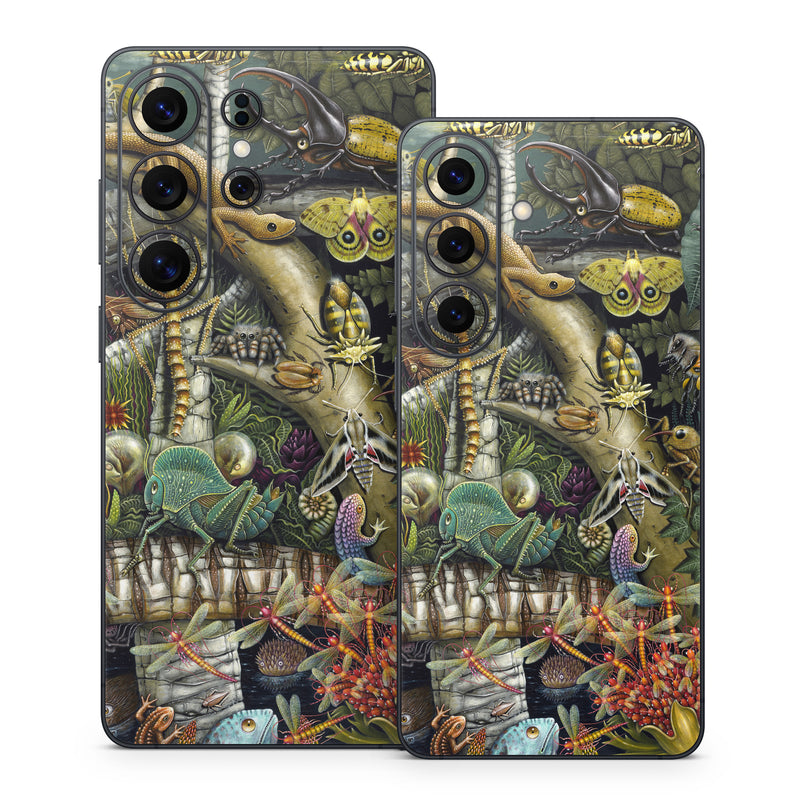 iStyles Samsung Galaxy S26 Series Skin design of Strategy video game, Mythology, Art, Games, Plant, Painting, Adventure game, Jungle, Fictional character, Nepenthes, with green, brown, red, yellow, gray, blue, white colors, and tagged with nature, fantasy, animals, flowers, animals, beetles, bugs, creatures, creepy, forest, insects, lizards, moths, spiders, fishes.
