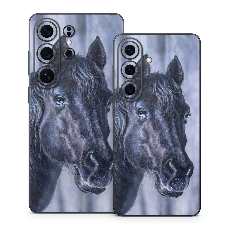 iStyles Samsung Galaxy S26 Series Skin design of Horse, Mammal, Vertebrate, Hair, Mane, Stallion, Snout, Mare, Mustang horse, Livestock, with black, white, blue colors, and tagged with fineart, animals, animal, animals, black, blue, farm, horse, mare, outdoors, stallion.