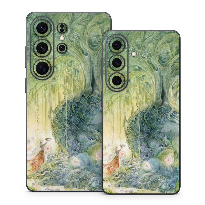 iStyles Samsung Galaxy S26 Series Skin design of Green, Watercolor paint, Painting, Water, Art, Illustration, Grass, Tree, Plant, Fictional character, with blue, green, red, yellow colors, and tagged with people, nature, fantasy, flowers, fairies, fantasy, landscape, sci-fi, tree.