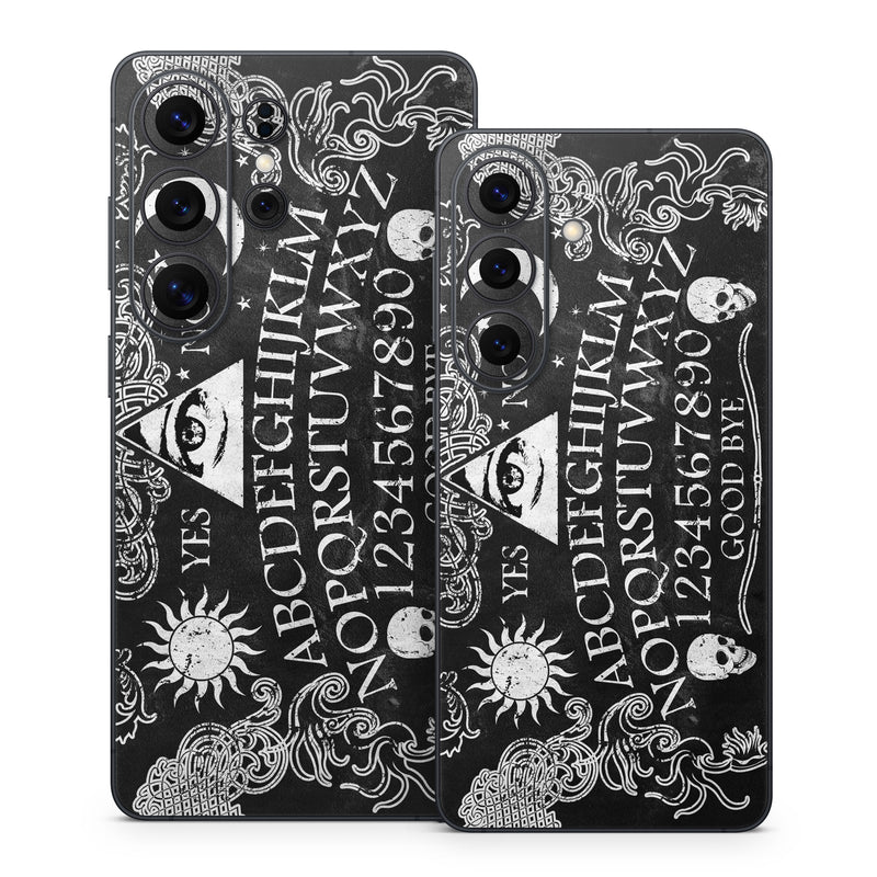iStyles Samsung Galaxy S26 Series Skin design of Text, Font, Pattern, Design, Illustration, Headpiece, Tiara, Black-and-white, Calligraphy, Hair accessory, with black, white, gray colors, and tagged with signs, skulls, black, demons, ghosts, magic, magick, paranormal, skull, spirit, talking.