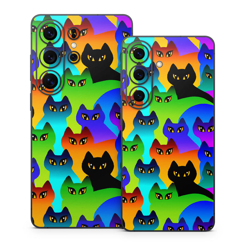 iStyles Samsung Galaxy S26 Series Skin design of Black cat, Purple, Cat, Small to medium-sized cats, Pattern, Design, Felidae, Illustration, Art, with black, blue, green, purple colors, and tagged with animals.