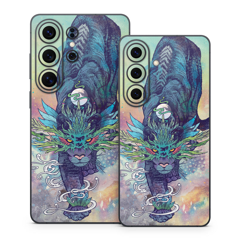 iStyles Samsung Galaxy S26 Series Skin design of Illustration, Fictional character, Graphic design, Demon, Art, Fiction, Cg artwork, Supernatural creature, with blue, green, black, white, yellow, orange, pink, purple colors, and tagged with abstract, animals, animals, cat, illustration, lion, surreal, tiger.