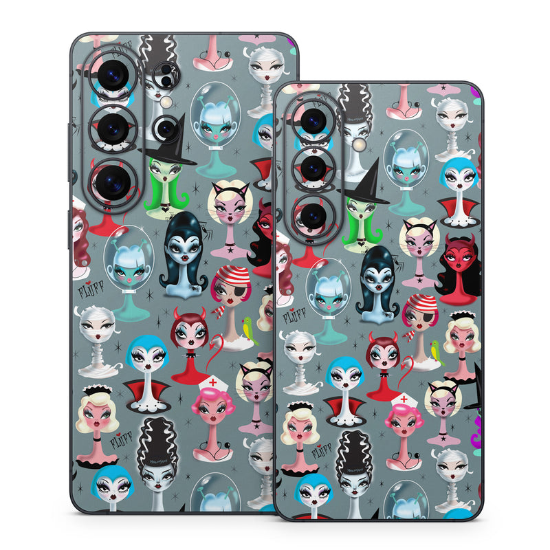 iStyles Samsung Galaxy S26 Series Skin design of Facial expression, Head, Design, Collection, Fictional character, Pattern, Skull, Illustration, Collage, Style, with gray, white, red, blue, green, black, pink, purple colors, and tagged with people, fantasy, objects, costume, halloween, horror, pinup, pinupgirl.